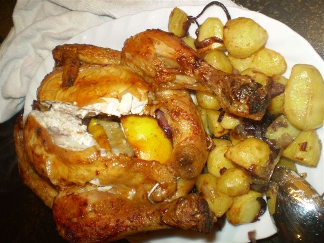 Zitrone halbieren und mit dem Brühwürfel ins Huhn stecken und verschliessen (Spiess oder zu nähen) salzen und pfeffern .Hähnchen mit etwas Öl in eine Auflaufform oder einen Bräter legen.